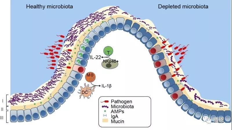 從下圖可以看出,左側(cè)的腸黏膜特點(diǎn)為存在致病微生物(Pathogen,紅色小蝌蚪狀),還存在豐富的益生菌(Microbiota,小螞蟻狀),只有很少的致病微生物進(jìn)入粘蛋白層(Mucin,黃色部分),而且在粘蛋白層內(nèi)存在豐富的抗菌肽(AMPS,紅色小圓點(diǎn))和免疫球蛋白A(IgA),此外免疫細(xì)胞T細(xì)胞也已被激活。而右側(cè),益生菌很少,這樣就無法誘導(dǎo)腸黏膜上皮細(xì)胞產(chǎn)生足夠的粘蛋白,薄的粘蛋白層起到的物理屏障就弱。
