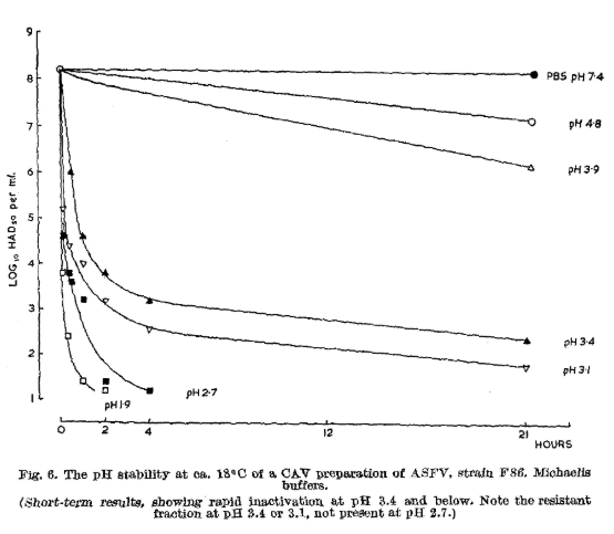 王博士答:可以,這里指的是飲水酸化。談到酸性物質(zhì)和非洲豬瘟,這里有一篇英國動物病毒研究所的Plowright和Parker于在1967年發(fā)表的文章。這篇文章從加熱和pH對非洲豬瘟病毒穩(wěn)定的影響進行了研究。請看這個圖,在pH7.4時非洲豬瘟病毒穩(wěn)定性沒有變化,而在pH4.8時非洲豬瘟病毒穩(wěn)定性開始下降。這篇論文給我們的啟示是:如果能夠降低豬的飼料(包括飲水)的pH,就可以“破壞”非洲豬瘟病毒。我們的四驅(qū)雙酸發(fā)酵料的pH在4.5以下,再輔以酸化的飲水(pH4.0),再加上胃酸的作用,[AW1] 對可能存在的非洲豬瘟病毒就會造成毀滅性打擊。