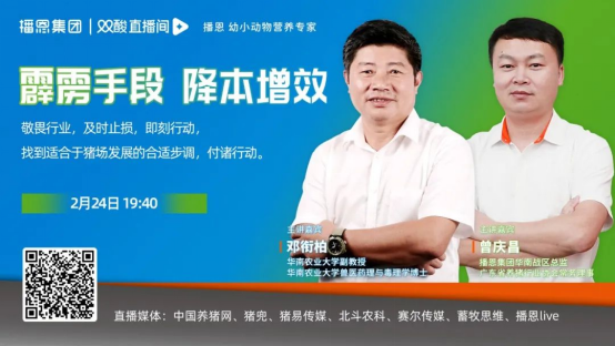 2月24日晚19:40,32萬+養(yǎng)豬網友齊聚播恩雙酸直播間,共同觀看了第三十三期訪談式直播《霹靂手段 降本增效》,本期直播邀請了華南農業(yè)大學副教授/獸醫(yī)藥理與毒理學博士鄧銜柏與播恩集團華南戰(zhàn)區(qū)總監(jiān)/廣東省養(yǎng)豬行業(yè)協(xié)會常務理事曾慶昌,期間中國養(yǎng)豬網、豬兜、豬易傳媒、北斗農科、賽爾傳媒、蓄牧思維、播恩live七大平臺進行同步轉播,鄧老師、曾總從技術與市場角度為著力點,通過實際案例、媒體數(shù)據(jù)進行觀點的闡述、交流,為網友們答疑解惑。