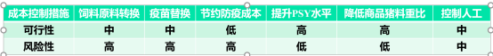 從降本措施來說,各項活動的可行性和風(fēng)險性都是并存的,如在進行飼料原料的更換時,可能會降低成本,但是也可能會引起豬的應(yīng)激反應(yīng)。