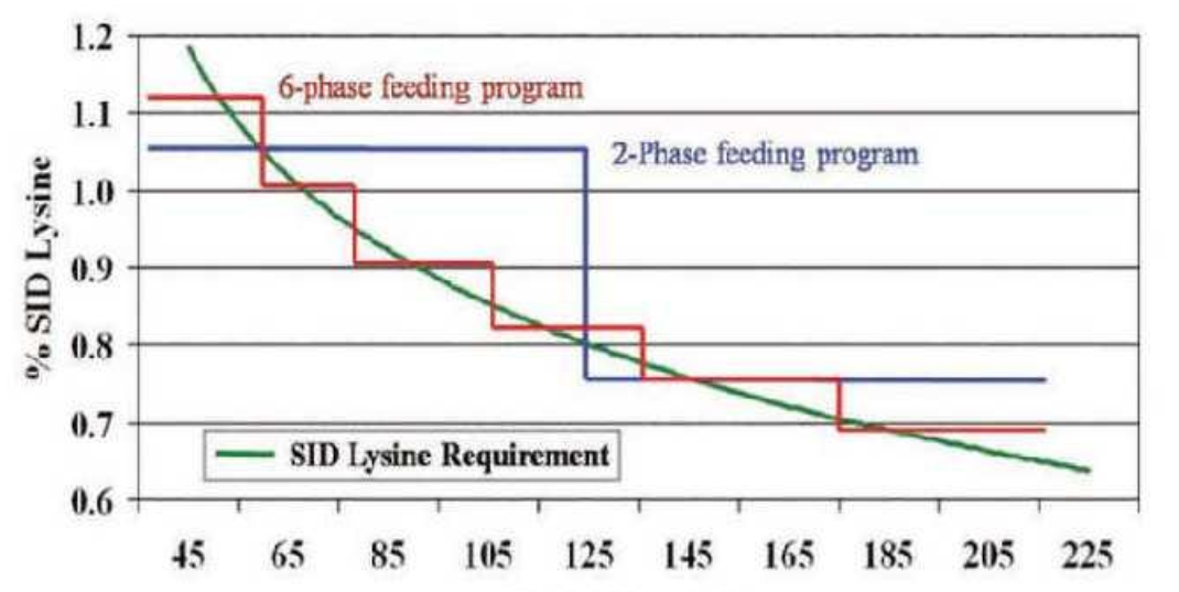 圖1展示的是商品豬從保育到育肥出欄,分兩階段飼喂和六階段飼喂的差異。兩種配方飼喂,方法雖然操作簡單,但會造成飼料隱性浪費??紤]到前期豬群體重小采食量低,飼料營養(yǎng)濃度一般較高,導(dǎo)致豬在生長過程中大多數(shù)時間處于營養(yǎng)過剩階段,營養(yǎng)物質(zhì)不能充分利用,多余的營養(yǎng)素増加了豬的代謝負(fù)擔(dān),且會隨糞便排出體外,造成飼料成本增加。過剰的營養(yǎng)還會增加糞便排放量,增加糞污處理難度。而多階段料飼喂則是比較精細(xì)化的飼喂方式,可保證豬群大多階段營養(yǎng)物質(zhì)的攝入正好可滿足自身的需要,依靠這種飼喂方法可滿足豬群的實際氨基酸需要,實現(xiàn)精準(zhǔn)飼喂及有效降低生產(chǎn)成本。在設(shè)計多階段日糧飼喂方案時可通過原料及營養(yǎng)指標(biāo)梯度設(shè)計來減少換料應(yīng)激。