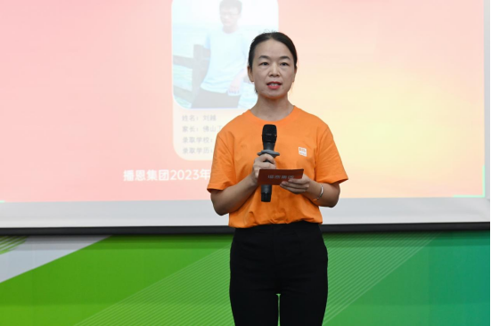 本次金榜題名頒獎(jiǎng)典禮,還特別邀請(qǐng)到了劉越(福建農(nóng)林大學(xué) 碩士研究生)的家長——馬良贏(佛山工廠綜合部綜合員,2023最美播恩人)作為家長代表發(fā)言。她首先對(duì)集團(tuán)一直以來提供的高水平員工福利表示衷心的感謝,從本次金榜題名活動(dòng)中,她也感受到深深的員工關(guān)懷。她十分感謝集團(tuán)提供了這樣一個(gè)和大家分享喜悅的機(jī)會(huì),并表示以后會(huì)更加珍惜自己的工作崗位,努力做更優(yōu)秀的播恩人,努力培養(yǎng)孩子成長成材,最后祝集團(tuán)發(fā)展越來越好,未來蒸蒸日上。