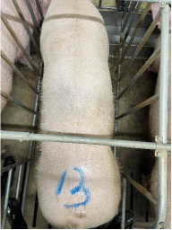 其次,不少豬場采用“目測+觸摸“體況評分法和卡尺評估法,存在很大的系統(tǒng)性誤差。圖(2)的兩頭母豬,從目測和觸摸感受的結(jié)果,肯定是左邊的母豬比右邊的母豬肥胖。但是,同一個人背膘(B超,P2點,下同)測定的結(jié)果如圖(3)所顯示的左邊的母豬背膘值13mm,比右邊的母豬的15mm,還少2mm。又如圖(4)和圖(5)兩頭母豬,從目測和觸摸感受的結(jié)果是相差無幾,但如圖(6)與圖(4)屬同一頭母豬,所顯示的母豬背膘值13mm,比圖(7)與圖(5)屬同一頭母豬,所顯示的背膘22mm,竟然薄了9mm。另外,夏季和冬季,因環(huán)境溫度差異大,人對母豬體況的感知的差異更大,可見“目測+觸摸“體況評分法的系統(tǒng)性誤差之大,不能高效的指導(dǎo)調(diào)控母豬飼料的飼喂量,本該加料的卻不加或加的不夠甚至減少,本該減料的不減或減少不夠甚至增加,導(dǎo)致飼料的浪費以及母豬繁殖性能的下降乃至降低母豬的使用壽命。