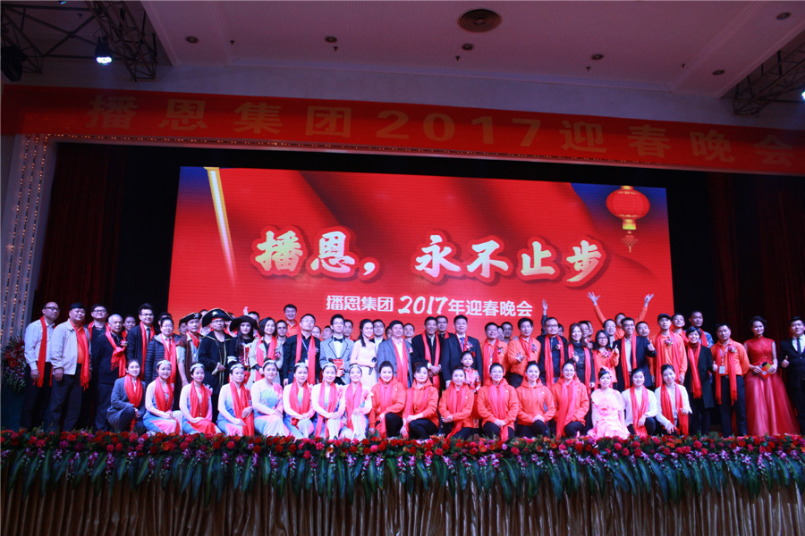 律回春暉漸,萬象始更新, 2月5日,播恩集團(tuán)在番禺祈福酒店隆重舉辦了以“播恩,永不止步”為主題的2017年度公司年會(huì)。集團(tuán)總裁鄒新華先生出席晚宴,并發(fā)表新年致辭。本次晚會(huì)共有來自各大區(qū)/事業(yè)部、工廠生產(chǎn)和管理代表,以及總部職能部門近300名員工一起共度新春。同時(shí),集團(tuán)還特邀了華南農(nóng)業(yè)大學(xué)傅偉龍教授、鄧銜柏教授等專業(yè)人士和同行業(yè)合作伙伴共享狂歡。